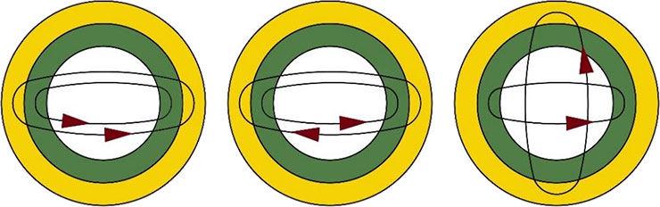 Рис. 12. Орбитали и направления движений по ним частиц в соседних оболочках сфер структуры атома