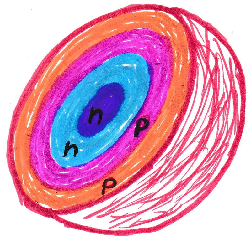 Тогда верна и ранее рассмотренная нами структура атома, когда в ядре чередуются независимые подвижные «прослойки» сфер вовлечённой в движение материи среды, образованные вихрями протонов и нейтронов. Такая конструкция формы единой вибросистемы ядра позволяет изменять архитектуру строения всего атома в зависимости от влияния магнитных полей извне. Когда многослойная сфера вихрей нейтронов (в центре) обволакивается подобной сферой вихрей протонов, и вся эта конструкция синхронизируется в общем вращении электромагнитных полей ядра атома. Таким образом каждый отдельный заряд нейтронов и протонов надёжно разделён друг от друга индивидуальной зоной влияния в едином электромагнитном поле ядра (см. Рис. 13). Ядерные связи между нуклонами в таких сферах имеют интенсивный характер обмена зарядами в очень плотной собственной среде пространства, что говорит о постоянных поглощениях и испусканиях излучений энергии не только между собой, но и извне ядра. По статистике из всех атомных ядер только четверть стабильны. То есть, взаимодействие энергий уплотнённых сред сферических оболочек, порождённых круговыми хаотичными орбиталями вихрей нуклонов, оказывают влияние на скачкообразное изменение свойств ядра как частицы. Ясно, что в такой зависимости каждый дополнительный нейтрон образует новую оболочку в своей сфере, а протон в своей. Вероятно, когда внутри атома под воздействием извне возникает новый нейтрон, то он «всасывается» (проталкивается) в центр ядра.