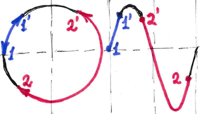 Подобные знакопеременные по амплитуде и по периоду колебания могут возникать в любой структуре элементарных частиц или атомов благодаря взаимному отталкиванию в результате образующихся вихрей среды окружения (правого, левого) или воздействию спинов сгустков материи «нулевых» вихрей самого пространства. Или влиянию, например, электрона (элементарной частицы) при его вращении вокруг собственной оси, которое также происходит от двух видовых вихрей диполя со смещением на 1/4Т периода.