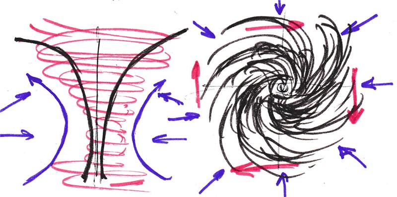 Значит ли это, что первопричиной образования любых вихрей являются вихри полей (магнитных, электрических), которые и воздействуют на частицы среды, запуская их вращение? Которым свойственны и колебания переменного направления с изменениями частот, амплитуд, периодов под воздействием отталкивающей их материи среды пространства, в том числе собственной формы вещества?