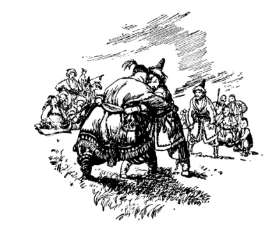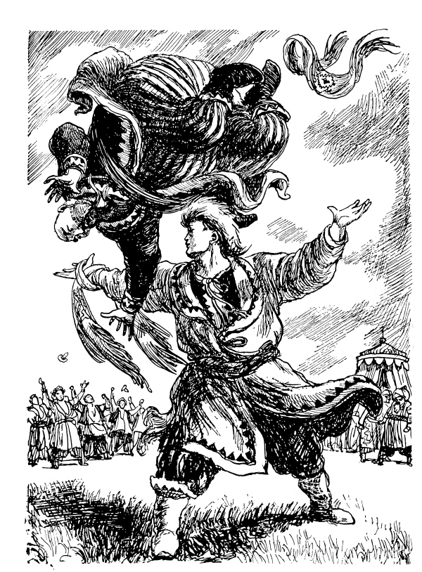 Вот они вышли в круг, сошлись и стали бороться. Обхватил царь молодого батыра обеими руками и хотел ударить его оземь. Но Акъял-батыр вывернулся, приподнял царя, подбросил его кверху высоко-высоко, а потом подхватил на лету и поставил на землю.