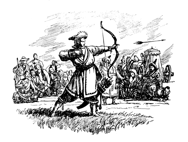 Увидели его везиры и другие знатные люди, стали смеяться и показывать на его старую одежду. Но он не слушал, что говорят о нём, взял свой лук, натянул тетиву и выстрелил. Стрела со свистом поддела перстень и вонзилась в стену царского дворца.