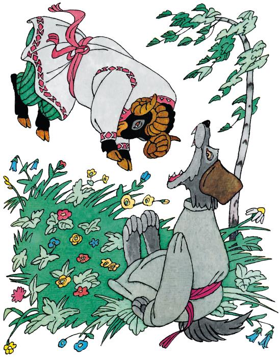 Сел перед бараном с разинутой пастью, а тот разогнался и со всех ног как саданёт волка рогами! Выбил ему передние зубы, да и вовсе чуть дух из него не вышиб.