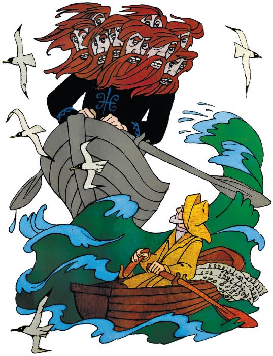Чуть край солнца стал подниматься из-за моря, подошёл рыбак с сыном к Большому камню. А Девятиголовый уж там. Посадил паренька в лодку и поплыл.