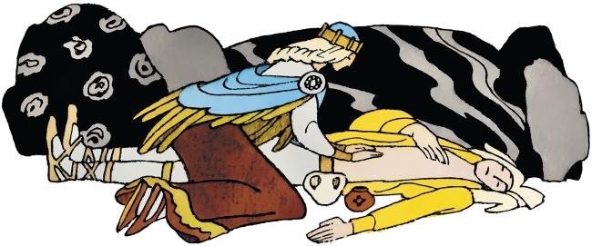 Присела над ним девушка, стала каким-то зельем смазывать ему раны, ссадины. И паренёк вдруг почувствовал, что всю боль как рукой сняло, а сам он – словно больше, сильнее стал. Дивится он.