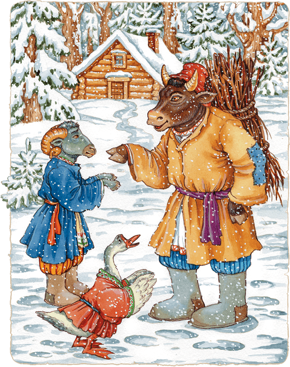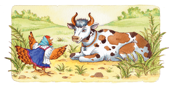 – Коровушка, голубушка, дай скорее молока, из молока хозяюшка собьёт маслица, маслицем смажу петушку горлышко: подавился петушок бобовым зёрнышком.