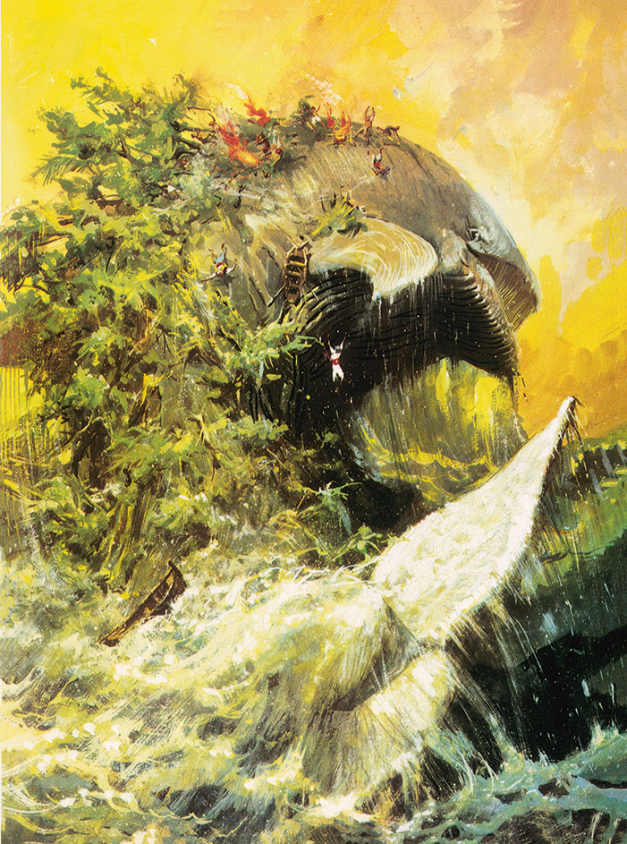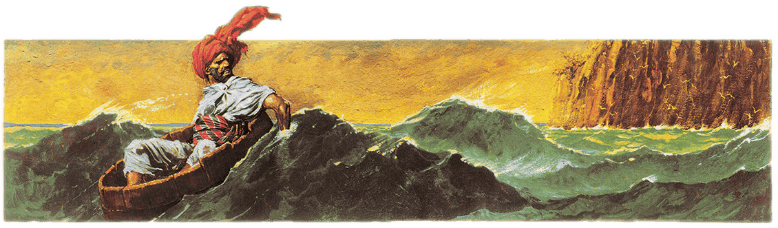 Многие месяцы мы плыли, не видя земли, покуда нашим взорам не предстал необыкновенный остров, залитый солнцем и утопавший в пышной растительности, – поистине райский уголок. Матросы и пассажиры с радостью ступили на твёрдую землю и разбрелись по острову нарвать плодов, помыться и приготовить пищу. Я тоже успел собрать немного хвороста, чтобы вскипятить воды, но тут земля внезапно ушла из-под ног, потом нас подбросило кверху и мы покатились в море вместе со всем скарбом. Вынырнув на поверхность и отыскав взглядом корабль, я оглянулся посмотреть на райский остров и увидел, что вовсе это не остров, а гигантская рыбина. Видимо, она так долго спала, что на спине у неё выросли деревья. Мы со своими кострами потревожили её, вот она и сбросила нас, а потом ударила хвостом по воде, так что огромные волны побежали в разные стороны. Капитан подумал, что его кораблю угрожает опасность, что попал в катастрофу и единственный уцелел, и немедленно поднял все паруса. Я тоже мог бы погибнуть, как остальные, но выжил – по милости Аллаха и благодаря деревянному корыту, за которое сумел ухватиться. Видимо, его прихватил с корабля на остров один из тех несчастных, что сгинули в морской пучине. Я крепко вцепился в него, а когда волны улеглись, видно, рыба успокоилась и уснула ещё лет на сто, осторожно работая ногами, поплыл в сторону от неё, стараясь оказаться как можно дальше. Спасибо ветру и течению, через полтора дня я доплыл до другого острова, больше похожего на высокий утёс, весь оплетённый лианами. Цепляясь за них, собрав всю свою волю, несмотря на усталость и слабость, кое-как вскарабкался я на вершину, где и рухнул без чувств.