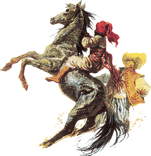 Конюхи тут же привели чудесную лошадь, но когда я попытался схватить её за сверкающую гриву, цокая серебряными копытами, она вырвалась из моих рук. Я бросился вдогонку и поймал её у входа в пещеру. Вскинув голову, она шарахнулась от моей протянутой руки, но приблизиться всё-таки позволила. Я вскочил ей на спину, мокрую и скользкую, как у рыбы, и крепко ухватился за серебряную гриву. Кобыла в страхе попятилась, взбрыкнула, но что она могла поделать с таким ловким наездником, как я?.. Слуги рассмеялись, а один даже шлёпнул её по чешуйчатому боку.