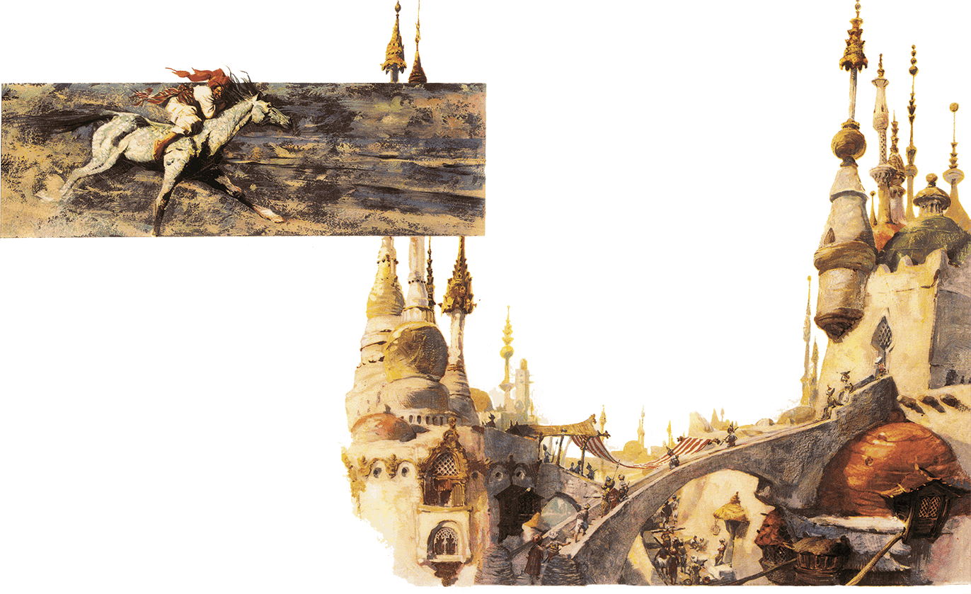 Проснувшись, птица рух взмахнула своими огромными крыльями и взмыла в небо, стремительно унося меня с собой. Я болтался у неё под лапой и отчаянно надеялся, что мой тюрбан выдержит и не порвётся. Так мы летели куда-то полдня, а потом я с облегчением понял, что снижаемся.
