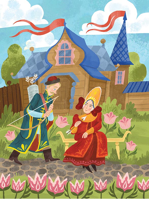 У старшего сына стрела упала на боярский двор, подняла стрелу боярская дочь. У среднего сына упала стрела на широкий купеческий двор, подняла её купеческая дочь.