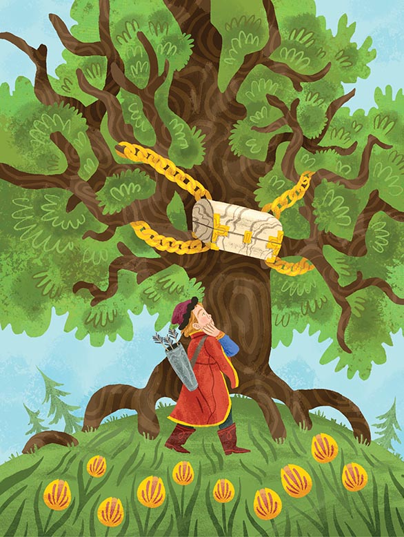 Иван-царевич у Бабы-Яги переночевал, и наутро она ему указала, где растёт высокий дуб. Долго ли, коротко ли, дошёл туда Иван-царевич, видит – стоит, шумит высокий дуб, на нём каменный сундук, а достать его трудно.