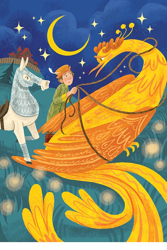 Не послушался стрелец своего коня, поднял перо жар-птицы, привёз и подносит царю в дар. «Спасибо! – говорит царь. – Да уж коли ты достал перо жар-птицы, то достань мне и самую птицу; а не достанешь – голова с плеч!» Стрелец залился горькими слезами и пошёл к своему богатырскому коню. «О чём плачешь, хозяин?» – «Царь приказал жар-птицу добыть». – «Я ж тебе говорил: не бери пера, горе узнаешь! Ну да не бойся, не печалься; это ещё не беда, беда впереди! Ступай к царю, проси, чтоб к завтрему сто кулей белоярой пшеницы было по всему чистому полю разбросано». Царь приказал разбросать по чистому полю сто кулей белоярой пшеницы.