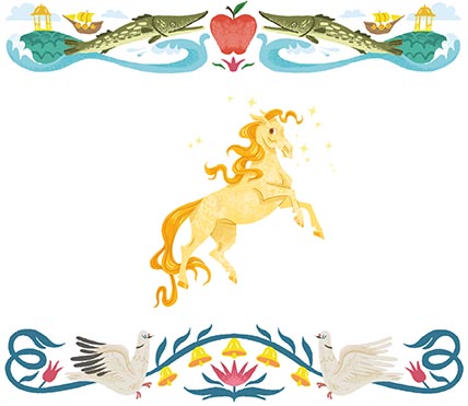А молодец поехал дальше, ехал-ехал, подъехал к одному двору, вошёл в избу: там сидит красна девица, ткёт утирки[7]. Он сказал: «Бог помочь тебе, красная девица!» А она ему: «Спасибо! Что, добрый молодец, от дела лытаешь или дело пытаешь?» – «Дело пытаю, красна девица! – сказал молодец. – Я еду за девять девятин, в десятое царство, в сад – за молодильными яблоками и за живой водой для своего старого и слепого батюшки». Она ему сказала: «Ну, мудро[8] тебе, мудро-мудро добраться до этого сада; однако поезжай, на дороге живёт другая моя сестра, заезжай к ней: она лучше меня знает и тебя научит, что делать». Вот он ехал-ехал до другой сестры, доехал; так же, как и с первой, поздоровался, рассказал ей об себе и куда едет. Она велела ему оставить своего коня у ней, а на её двукрылом коне ехать к её старшей сестре, которая научит, что делать: как побывать в саду и достать яблоко и воды. Вот он ехал-ехал, приехал к третьей сестре. Эта дала ему своего коня об четырёх крыльях и приказала: «Смотри, в этом саду живёт наша тётка, страшная ведьма; коли подъедешь к саду, не жалей моего коня, погоняй хорошенько, чтоб он сразу перелетел через стену; а если он зацепит за стену – на стене наведены струны с колокольчиками, струны заструнят, колокольчики зазвенят, она проснётся, и ты от неё тогда не уедешь! У ней есть конь о шести крыльях; ты тому коню у крыльев подрежь жилки, чтоб она на нём тебя не догнала».