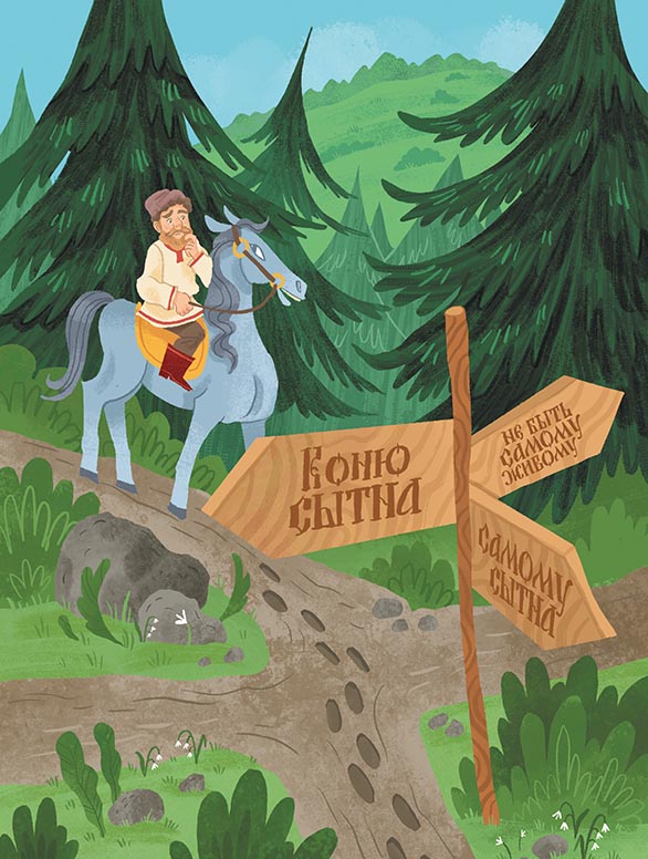 Один царь очень устарел и глазами обнищал[2], а слыхал он, что за девять девятин, в десятом царстве, есть сад с молодильными яблоками, а в нём колодец с живою водою: если съесть старику это яблоко, то он помолодеет, а водой этой помазать глаза слепцу – он будет видеть. У царя этого было три сына. Вот он посылает старшего на коне верхом в этот сад за яблоком и водой: царю хочется и молодым быть, и видеть. Сын сел на коня и отправился в далёко царство; ехал-ехал, приехал к одному столбу; на этом столбе написано три дороги: первая для коня сытна, а самому голодна, вторая – не быть самому живому, а третья коню голодна, самому сытна.