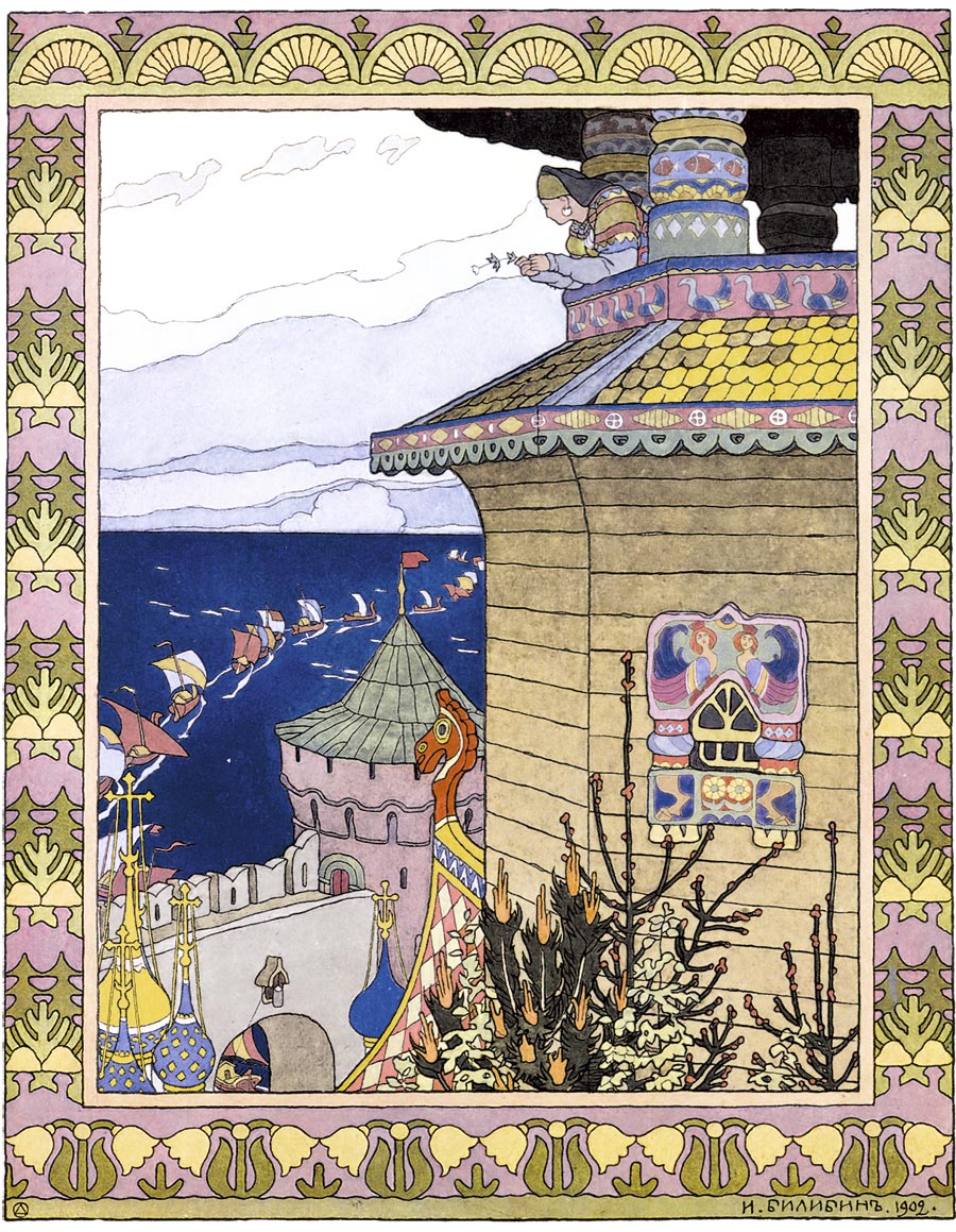 Поблагодарила девица старуху и пошла за своим клубочком. Шла-шла, вышла на берег синего моря – широкого и раздольного, – а вдали как жар горят золотые маковки на высоких теремах белокаменных.