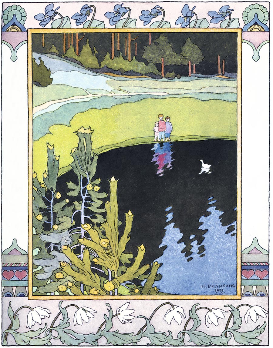 Она их вырастила, стали они по реченьке ходить, злату рыбку ловить, лоскутики собирать, кафтаники сшивать, да выскакивать на бережок, да поглядывать на лужок.