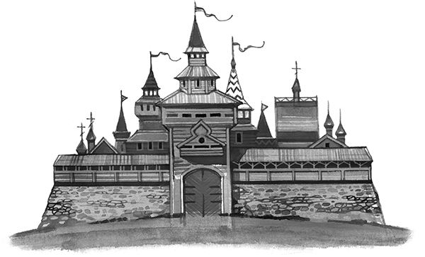 Поехал Илья с Соловьём к Киеву, а под Киевом у Соловья другая застава – подворье его Соловьиное. Стоят Соловьиные палаты белокаменные, двор на семи столбах, на семи верстах, вокруг железный высокий тын, а на каждой тынинке по маковке, на каждой маковке по голове богатыря убитого. Посреди двора три терема златоверхие, верхи с верхами свиваются, потолки с потолками сливаются, крылечки с крылечками сплываются, а промеж теремов сады рассажены зелёные с цветами лазоревыми. Под теремами залегают погреба глубокие, а в них много несчётной золотой казны награбленной, много всякого богатства, добра наворованного. Жила в этом подворье семья Соловьиная: молодая его жена, да дочери – удалые поленицы[9], да мужья их, зятья Соловьиные, все богатыри сильные, могучие.