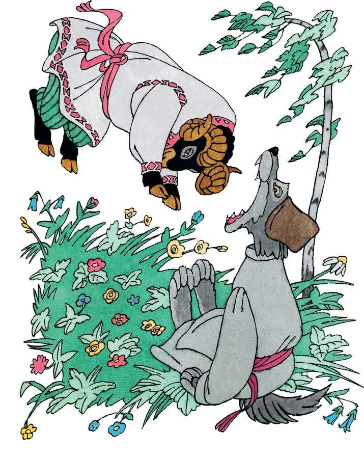 Сел перед бараном с разинутой пастью, а тот разогнался и со всех ног как саданёт волка рогами! Выбил ему передние зубы, да и вовсе чуть дух из него не вышиб.