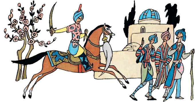 – Не стану я его искать! – кричит владелец верблюда, выхватывая саблю. – Верните мне верблюда, жену и сына!