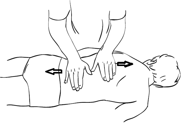 Для этого кладем ладони перпендикулярно позвоночнику в районе поясницы и с легким нажимом проводим одной ладонью вверх в сторону груди, а другой ладонью вниз в сторону копчика, как бы растягивая позвоночник в разные стороны.