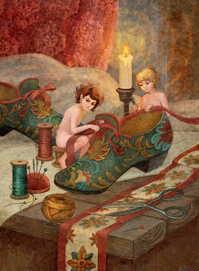 Работа была тонкой и кропотливой. Сшила Эльза по крошечным штанишкам с лампасами, по суконному сюртучку с пуговичками, кармашками и отворотами, по тонкой сорочке с вышивкой и с кружавчиками; малюсенькими спицами связала она длинные полосатые чулочки с пяточками и помпончиками. И самое главное – из заморского шелка сшила Эльза два ярких кушачка-пояса, а суконные остроконечные колпачки расшила бисером и камешками. Одежда получилась – загляденье. Дитер много ночей в шкафу провел – все смотрел, как малыши работают. Ни разу себя не выдал, не чихнул, дверью не скрипел – боялся, что убегут. И сделал затем две пары крошечных башмачков – у эльфов красивее не бывает! На эту работу у Дитера и Эльзы весь адвент и ушел.