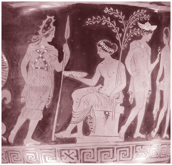 Бендида (слева) и Аполлон. Изображение на кратере. 380–370 годы до н. э.