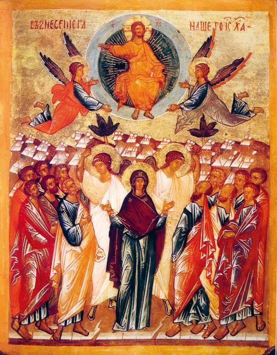 На сороковой день по Пасхе все апостолы собрались в Иерусалиме в том доме, где обычно собирались для молитвы вместе с Матерью Божией. Здесь произошла последняя беседа Спасителя с учениками, когда Он повелел им оставаться в Иерусалиме и ждать Духа-Утешителя, Которого пошлет Отец Небесный и Который будет во всем наставлять апостолов. После этого Он вывел всех из стен Иерусалима, и пошли к горе Елеонской и, достигнув ее вершины, остановились. Господь поднял руки, благословил всех и стал медленно подниматься на глазах учеников все выше и выше в небо, пока совсем не скрылся из вида. С изумлением смотрели апостолы и Матерь Божия на это чудо, пока явившийся ангел не возвестил им, что Господь вознесся к Отцу Своему и придет день, когда Он вернется так же, как видели Его возносящимся на небо. Поклонившись вознесшемуся Господу, ученики Его возвратились в Иерусалим с великой радостью, радовались ученики славе Своего Учителя, которую видели. Радовались, что истинно призваны на дело Божие, великое и святое…