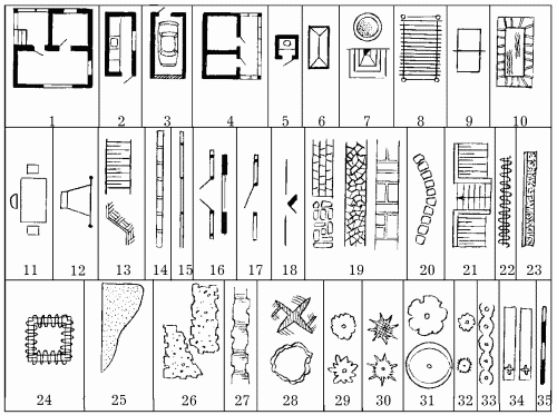Рис. 2. Условные обозначения: 1 – дом, 2 – летняя кухня, 3 – гараж, 4 – хозяйственные постройки, 5 – дворовый туалет, 6 – компост, 7 – дворовый камин или очаг, 8 – навес, 9 – спортивная площадка, 10 – купальный или декоративный водоем, 11 – уголок отдыха, 12 – детская площадка, 13 – насыпь, 14 – бордюр, 15 – ограда, 16 – ворота, 17 – калитка, 18 – вход, 19 – дорожки, 20 – тропинки с покрытием, 21 – подпорная стенка с лестницей, 22 – трельяж, 23 – вертикальное озеленение, 24 – пергола, 25 – газон, 26 – цветники, 27 – живая изгородь, 28 – высокорослые дикорастущие деревья, 29 – декоративные деревья, 30 – хвойные деревья, 31 – сильнорослые плодовые деревья, 32 – слаборослые плодовые деревья, 33 – ягодный кустарник, 34 – огород, 35 – масштаб.