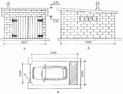 Рис. 6. Кирпичный гараж: а – общий вид, фасад, б – вид сбоку, в – оптимальные размеры гаража.