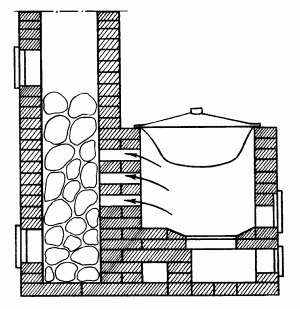 Чаще всего печи-каменки возводят из огнеупорного кирпича. Толщина стен может быть либо в полкирпича, либо в кирпич. На топливник уходит в среднем 150 кирпичей и по 20 кг песка и глины. Над топливником помещают котел, снабженный крышкой. Его соединяют газоотводными трубами с камерой каменки, наполненной гранитными камнями с добавлением чугунных чушек.