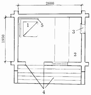 Рис. 8. Схема простейшей бани: 1 – каменка, 2 – полки, 3 – отдушина, 4 – кольцо, 5 – тепловой экран.