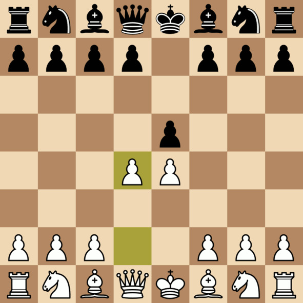 1. e4 e52. d4 d53. dxe5 de4. Qxd8+ Kd85. Nc3 Nc66. Bf4 Be67. Nxe4 Nh68. Nf3 Be79. Nfg5 Bg510. O-O-O+ Ke711. Bxg5+Ke812. Nc5 Rd813. Bb5 Rd114. Rxd1 a615. Rd8#