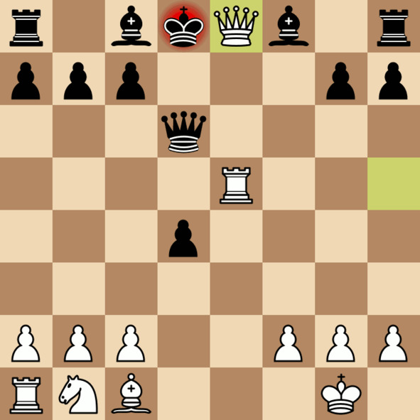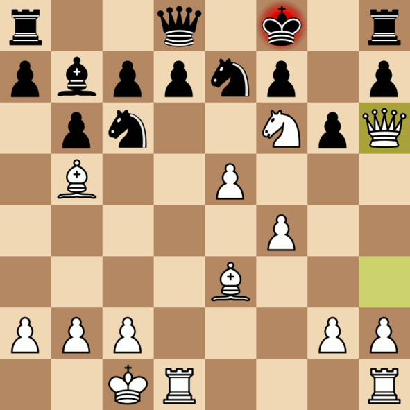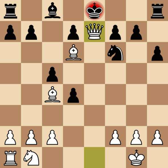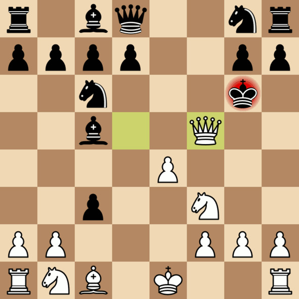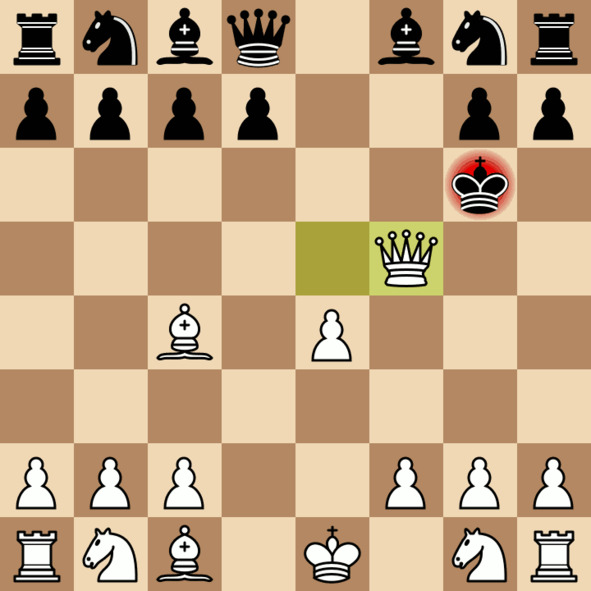 1. e4 e52. d4 ed3. Bc4 Qh44. Qxd4 Nf65. Nc3 Nc66. Qe3 Bb47. Nf3 Qe48. Bxf7+ Kf79. Ng5+ Kg610. Nxe4 d511. Nxf6 gf12. Qh6+ Kf713. Qh5+ Kg714. Bh6+ Kg815. Qxd5+ Be616. Qxe6#