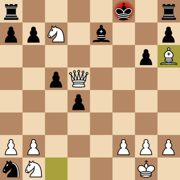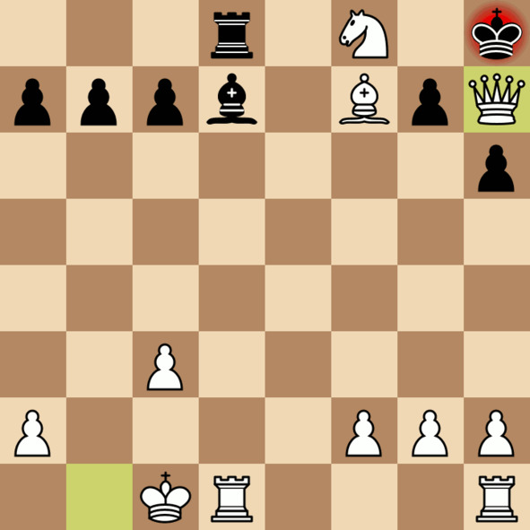 1. e4 e52. d4 ed3. Bc4 d54. exd5 Bb4+5. c3 dc6. Qa4+ Nc67. Nxc3 Bc38. bxc3 Ne79. dxc6 Nc610. Nf3 Bd711. Bg5 Ne712. Qb3 0—013. O-O-O Rb814. Ne5 h615. Bxf7+ Kh816. Bxe7 Qe717. Ng6+ Kh718. Nxe7 Rbd819. Qb1+ Kh820. Ng6+ Kh721. Nxf8++ Kh822. Qh7#