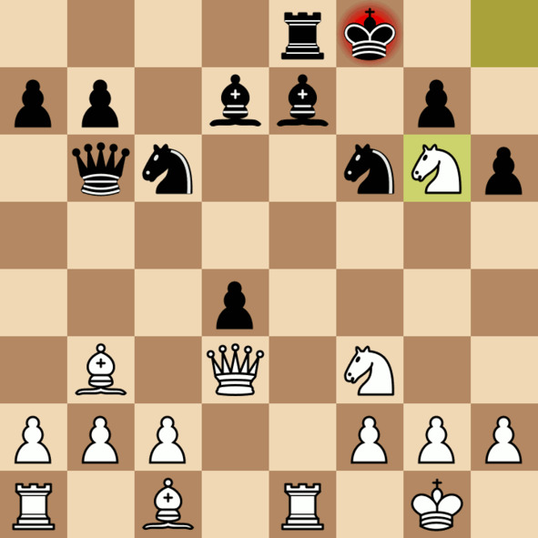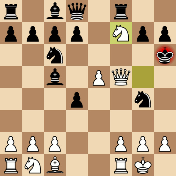 1. e4 e52. d4 ed3. Bc4 d64. c3 dc5. Nxc3 Be76. Qb3 Be67. Bxe6 fe8. Nf3 Nf69. Ng5 Nbd710. Nxe6 Qc811. Nxg7+ Kpf812. Bh6 Rg813. Nf5+ Ke814, Qe6 Rf815. Qxe7#