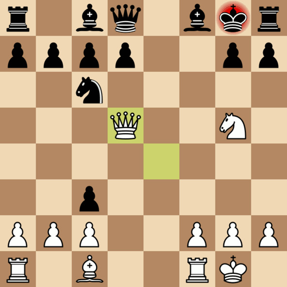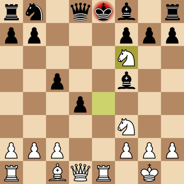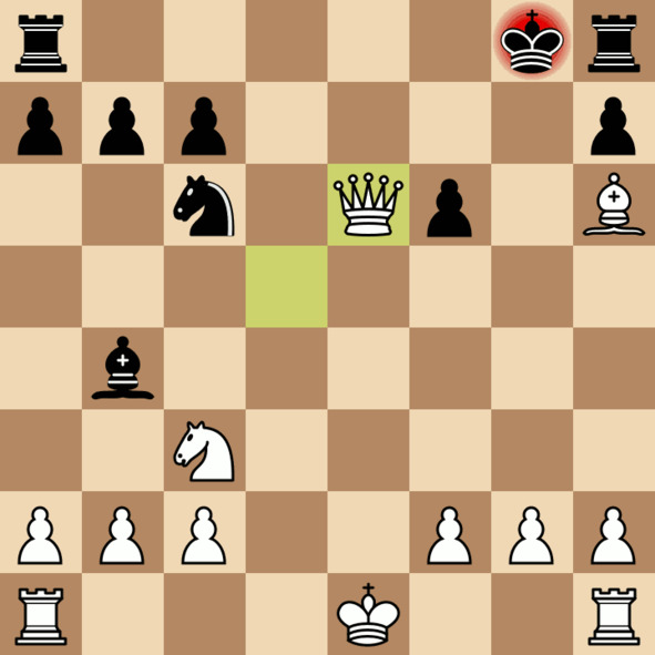1. e4 e52. d4 ed3. Bc4 Nc64. Nf3 Nf65. Ng5 d56. exd5 Nd57. O-O Ne58. Re1 f69. Nf3 Qd610. Nxe5 fe11. Qh5+ Kd812. Bxd5 Qd513. Rxe5 Qd614. Qe8#
