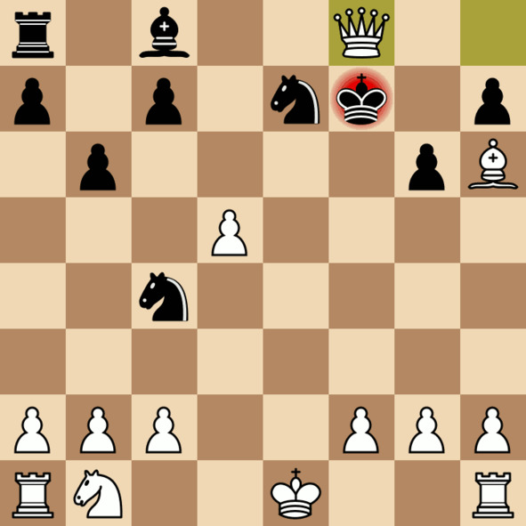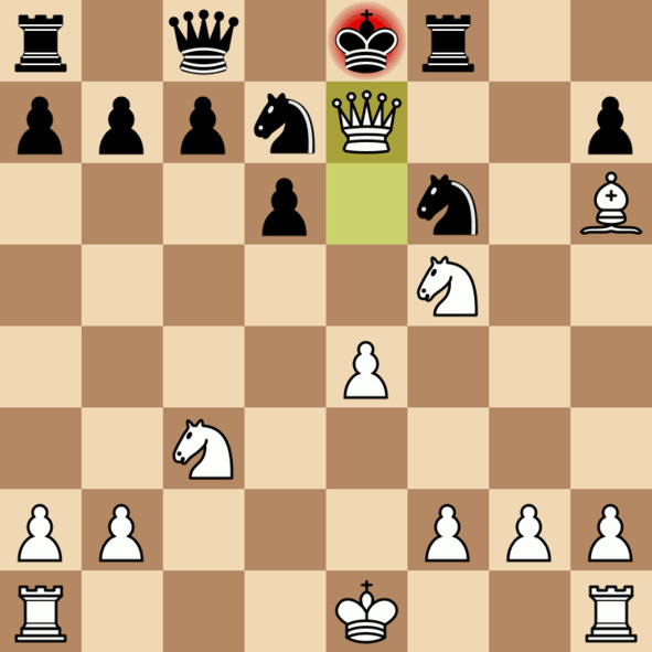 1. e4 e52. d4 ed3. Bc4 c54. Nf3 h65. Ne5 Qe76. Nxf7 Qe47. Kf1 Rh78. f3 Qh49. Qe2+ Ne710. Nd6+ Kd811. Nf7+ Kc712. Qe5+ Kc613. Qd6#