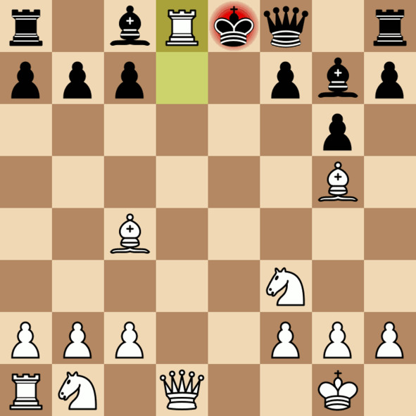 1. e4 e52. d4 ed3. Bc4 Nc64. Nf3 Qf65. O-O h66. e5 Ne57. Nxe5 Qe58. Re1 Qe19. Qxe1+ Be710. Bf4 c511. Bd6 Nf612. Qxe7#