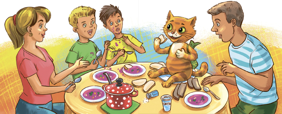 Табуреток у Кузькиных было всего четыре. Толик уступил место гостю, а себе прикатил из комнаты компьютерный стул. Мама поставила перед котом тарелку дымящегося супа. Котоваська вдохнул запах и зажмурился от удовольствия.