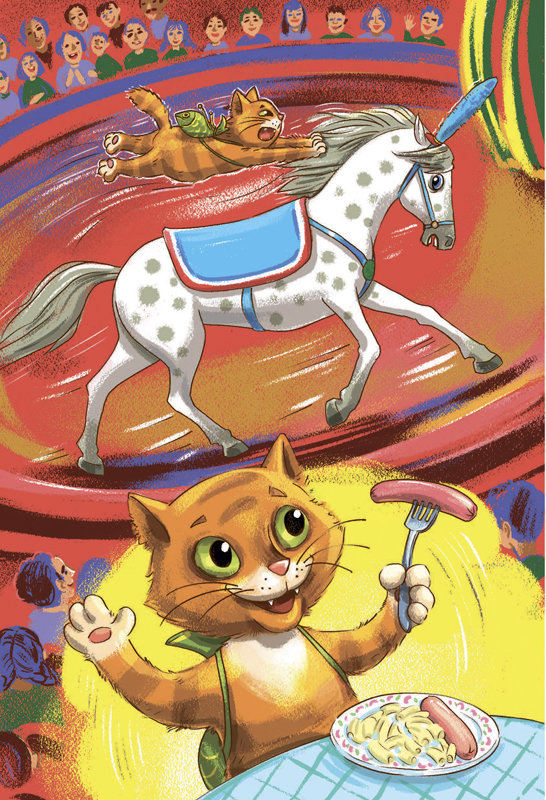 Лошадь давно работала в цирке и уже ничему не удивлялась. Не ожидала она только одного – что в один прекрасный день на спину ей шлёпнется большой рыжий кот.