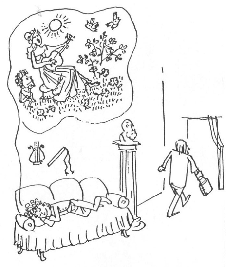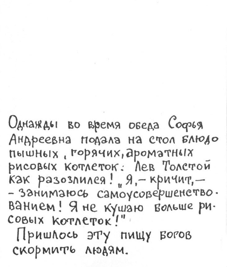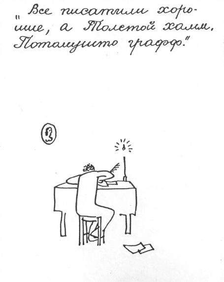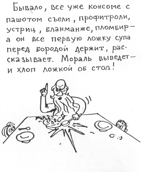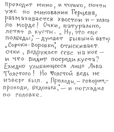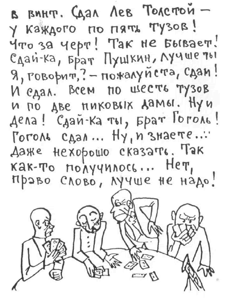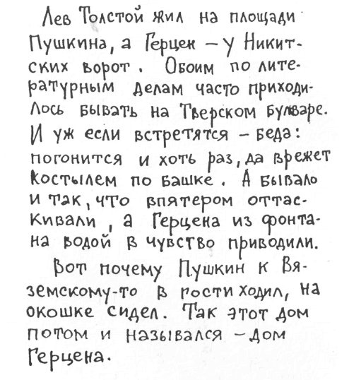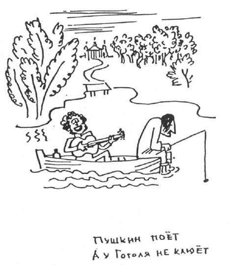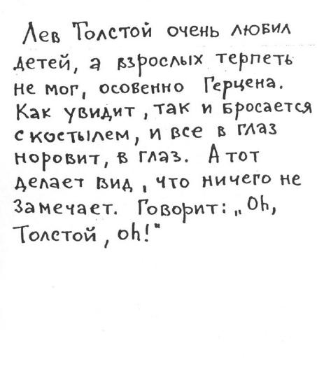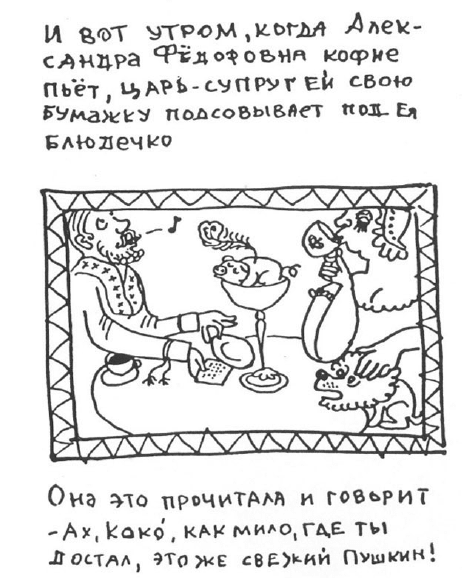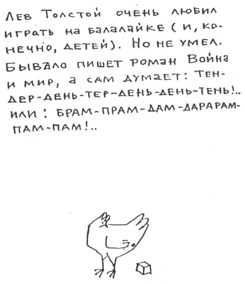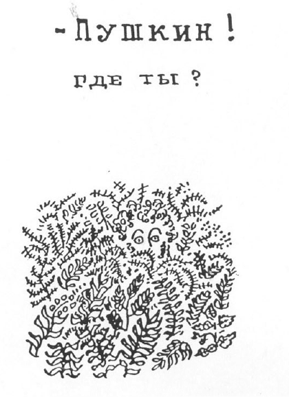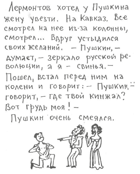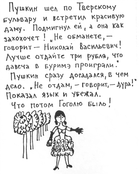 Другой источник – школьно-народные анекдоты про Пушкина (как правило, глупые и неприличные: «Пушкин, где ты? Во мху я!»). Или вот еще: помните, как царь пригласил Пушкина обедать, а стул ему не поставил. Пушкин пришел, что поделаешь – стал в сторонке. Тут царя позвали к телефону. Он так с пирогом в руке и пошел. Пушкин быстренько сел на его место, ест. Царь вернулся, встал рядом, пирог доедает, а Пушкин как будто не видит, ест себе. Царь разозлился и спрашивает: «Пушкин! Чем отличается человек от свиньи?» А Пушкин отвечает: «Тем, что человек ест сидя, а свинья стоя». Еще были такие песни про графа Толстого абсурдные, их пели все – думаю, что мы их тоже тогда знали.