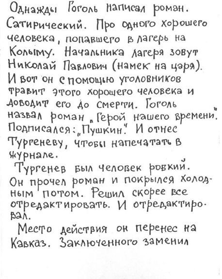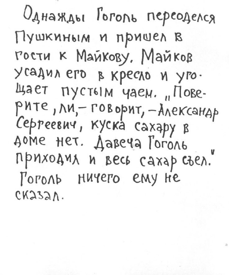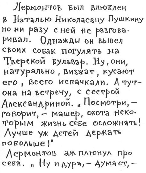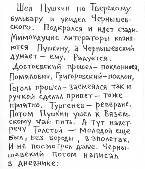 Что касается подражания Хармсу – конечно, оно было, самое прямое. Хотя сама я «Анегдоты» Хармса о Пушкине не читала – негде было. А Пятницкий Хармса очень любил и нам очень артистично пересказывал. Однажды ночью, на прогулке, они с приятелем, которого звали Ванькой Тимашевым (он потом сгинул куда-то), вдвоем сыграли по ролям пьеску «О, черт! Обратно об Гоголя!» – очень красиво падали.