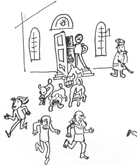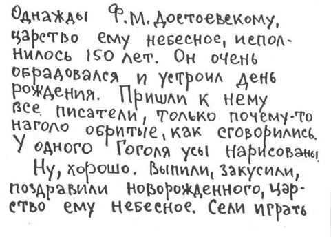 Пятницкий жил тогда у нас в семье, а мы увлекались папье-маше, лепили и раскрашивали маски в огромном количестве. Володя слепил из пластилина портреты Пушкина, Гоголя, Толстого и Достоевского[4]. Таня оклеила их мелкими бумажками – у него на такую монастырскую работу не хватило бы терпения – а он потом раскрасил, не придерживаясь натурализма. Со временем мама[5] приклеила им волосы, бороды и бакенбарды, а пока они висели голые и лысые, Ф. М. Достоевскому, царство ему небесное, как раз исполнилось 150 лет. Так возникла соответствующая новелла.