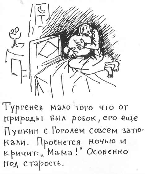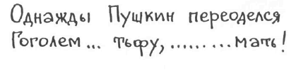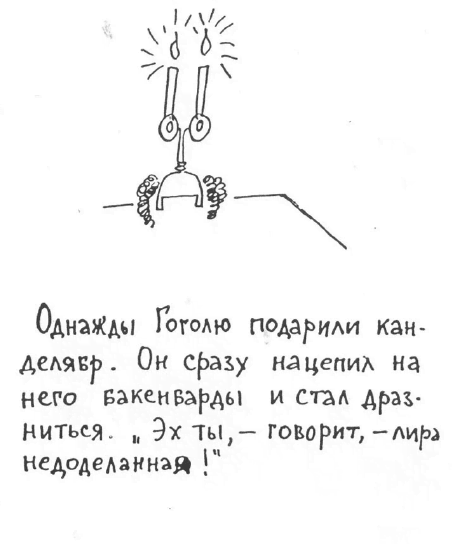 «Гоголь ни разу не видел оперу Пушкина «Борис Годунов», а очень хотелось. Вот он переоделся Пушкиным и пошел в театр. В дверях столкнулся с Вяземским, а тот и говорит: – Что это у тебя сегодня, Alexandre, нос, как у Гоголя, право!»
