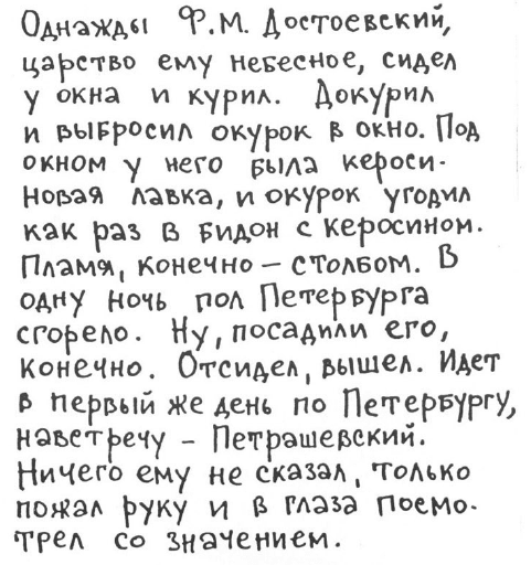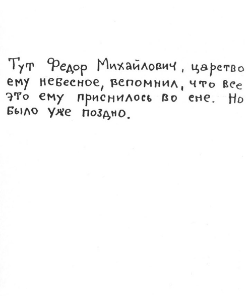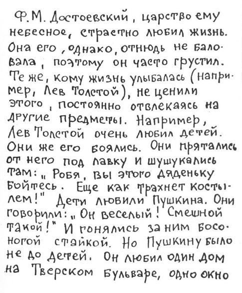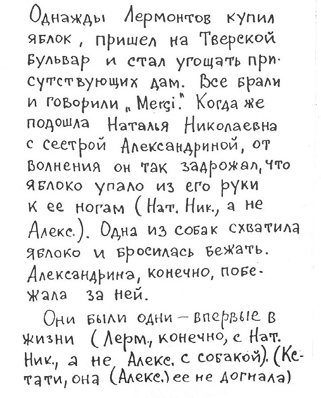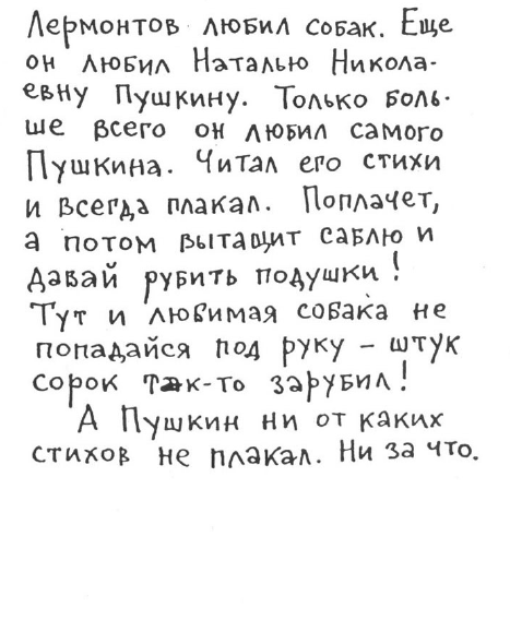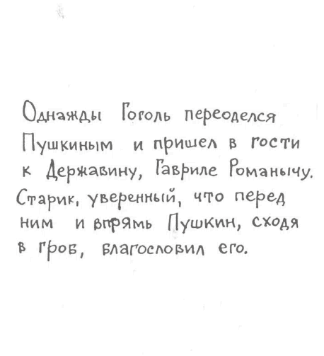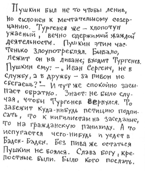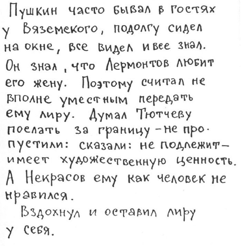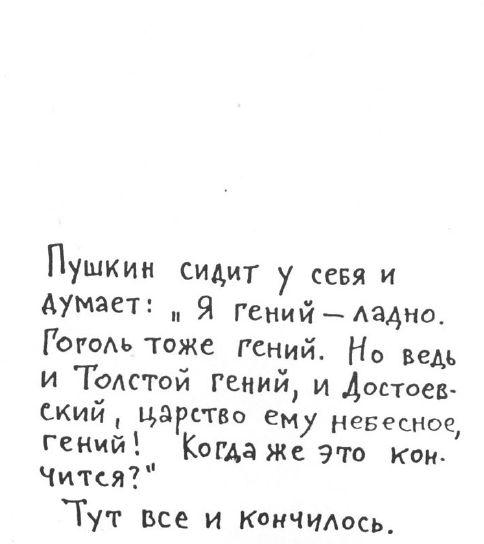 Он же закончил текст «Пушкин сидит у себя и думает: Я гений, ладно (…) когда же это кончится?» – фразой: «тут все и кончилось».