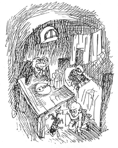 Потом мы не могли остановиться. Стоило открыть рот, новая история возникала как бы сама. При этом, как нарочно, под рукой оказался блокнот подходящего размера. Кажется, его выдали на конференции кому-то из знакомых, а он мимоходом оставил у нас. Все, что сочинялось, записывали сразу набело, и так же Пятницкий рисовал картинки. Все рисунки – его. Текстов, кажется, моих больше. Есть общие. Мои, как правило, длиннее, Володины – гениальнее.