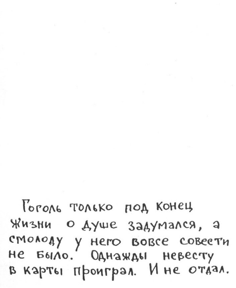– Гоголь только под конец жизни о душе задумался, а смолоду у него вовсе совести не было. Однажды невесту в карты проиграл.