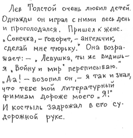 Перед вами – один из самых любопытных маргинальных текстов советского времени. Он в огромном количестве копий гулял в самиздате, но в полном, оригинальном виде до сих пор его не издавал никто. У него даже нет узнаваемого названия – авторское «Веселые ребята» не прижилось, «Анекдоты о писателях» звучит расплывчато, а ведь еще есть «хармсинки», «псевдо-Хармс» или даже «Фальшивый Хармс». Для представителей трех или даже четырех поколений он стал источником универсальных цитат, набором «мемов» еще доинтернетовской эпохи на все случаи жизни. Выражения «Лев Толстой очень любил детей», «и уехал в Баден-Баден», «и в глаза посмотрел со значением», «тут все и кончилось», как пароль, помогали малознакомым людям мгновенно опознать своих, а стилистика анекдотов о знаменитостях вызвала бесчисленное количество подражаний.