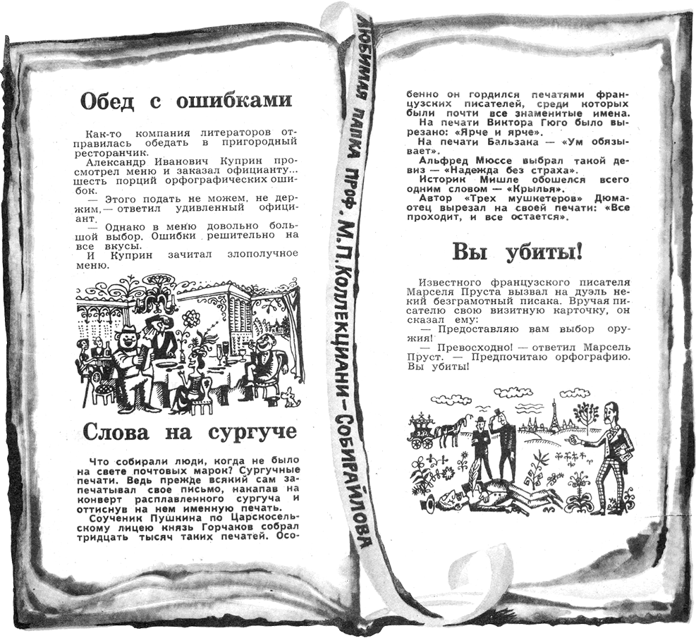 Иллюстрация к рубрике «Любимая папка Коллекциани-Собирайлова» с литературными анекдотами из жизни писателей в журнале «Пионер». Худ. В. Пятницкий