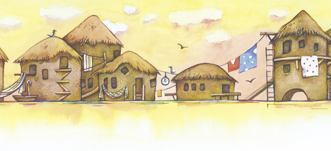 Крыши домов были укрыты камышом. А вода под домами – тёплая в любое время, даже когда шёл дождь. Это очень важно, ведь никогда не знаешь наперёд, когда тебя угораздит проснуться!